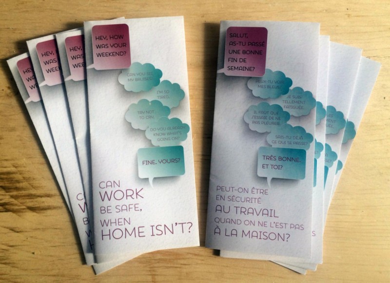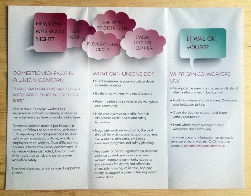 The Public worked with the Canadian Labour Congress to design a poster and pamphlet bringing awareness to domestic violence as a union concern and suggestions for what unions and co-workers can do to support each other.