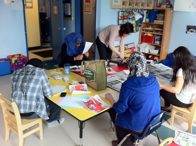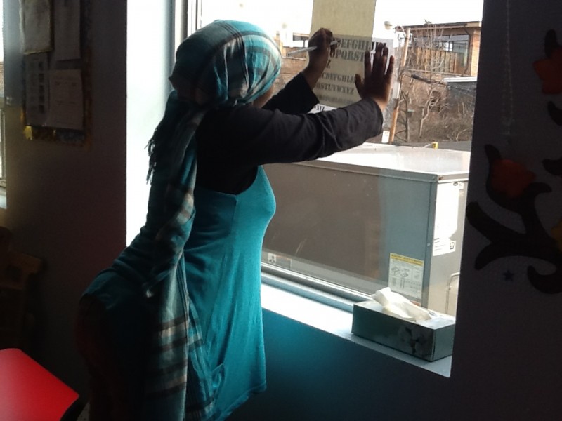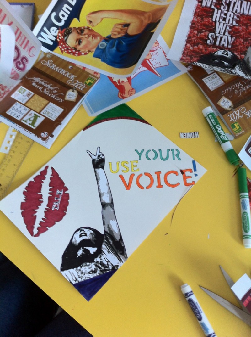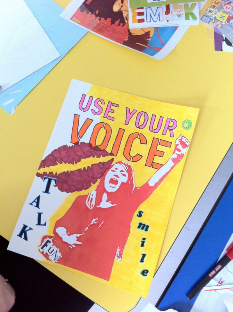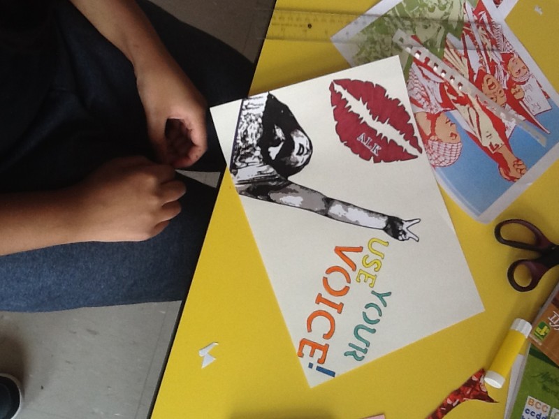 The girls split into groups to spread the Use Your Voice message — by making posters, a website, zines, a podcast and a social media strategy. The poster group re-mixed creative commons material from Occuprint, Just Seeds, and other resources on the net, and used some stencils and lettersets prepared by us in advance. It was amazing to see what they came up with! They also screen printed patches as a special gift to the whole group!