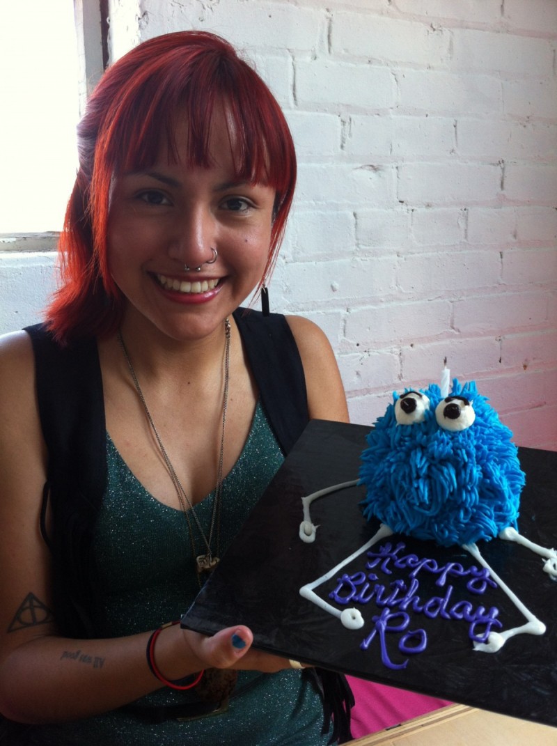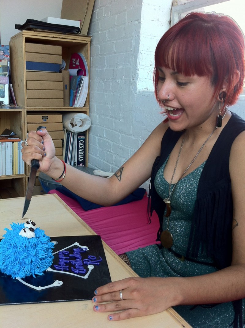 To celebrate, we got her a strange cake! Then, she stabbed it.
