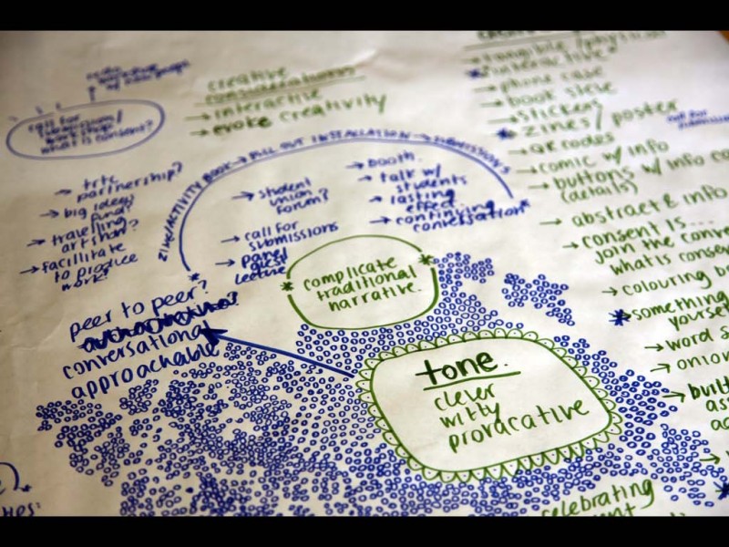 Last month, The Public facilitated two workshops with the consent working group at OCAD University looking to build consent culture on campus in intersectional and anti-oppressive ways. Our first workshop explored anti-oppression in collaboration with Maria from the Toronto Rape Crisis Centre (TRCC) where we discussed what consent looks like on campus. In our second workshop, participants designed creative outreach strategies for students including a zine and interactive installation coming out this fall, and a curated art show/panel in spring!
