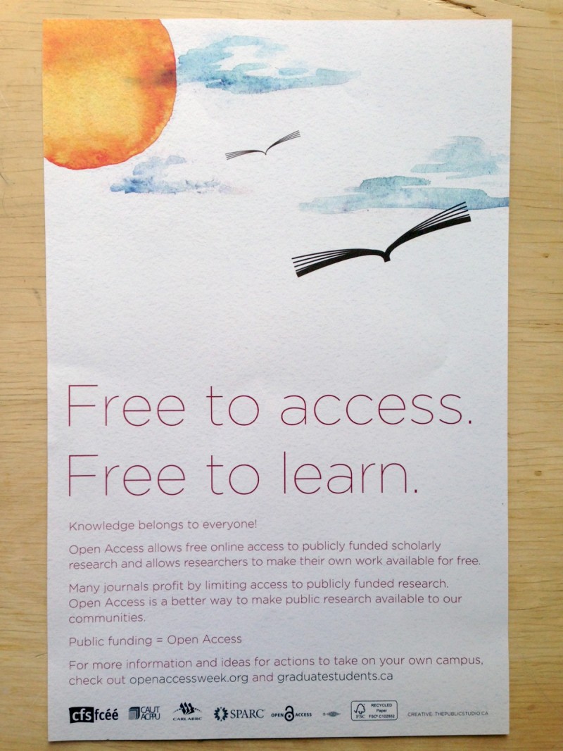 Open Access allows free online access to publicly funded scholarly research and allows researchers to make their own work available for free. It’s a way of connecting our communities with valuable research. For the 2012/2013 Open Access week, we partnered with the Canadian Federation of Students to create on-campus posters that explain the issue and direct students to more information.