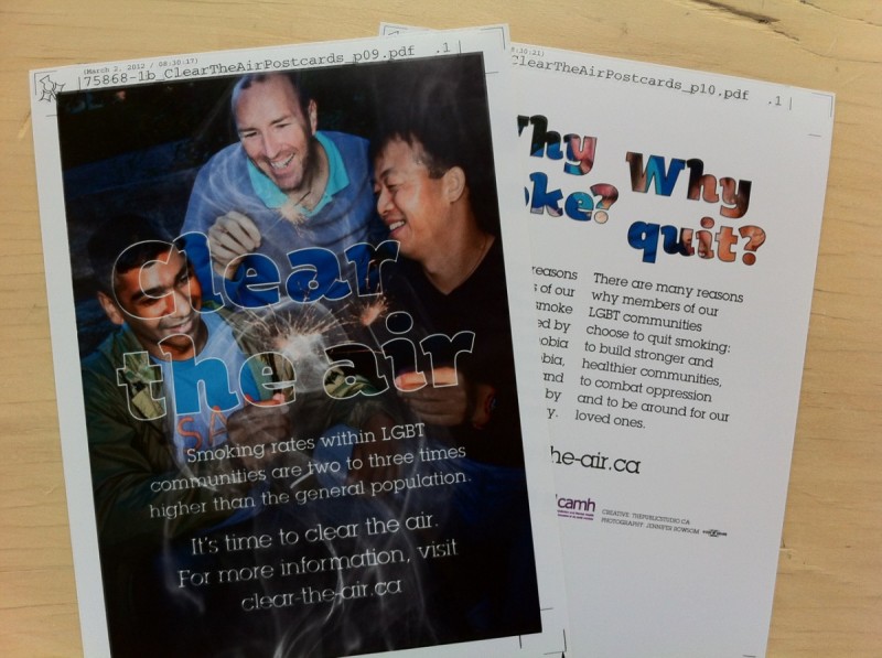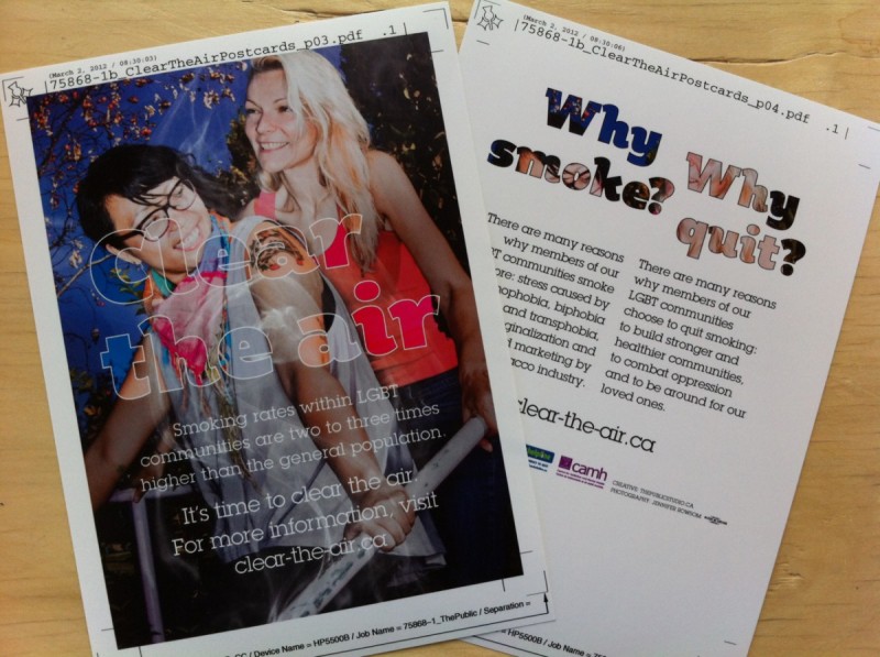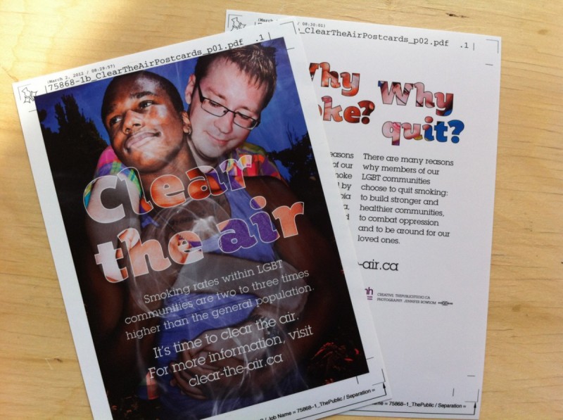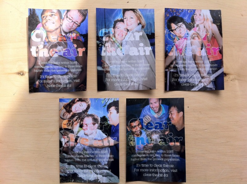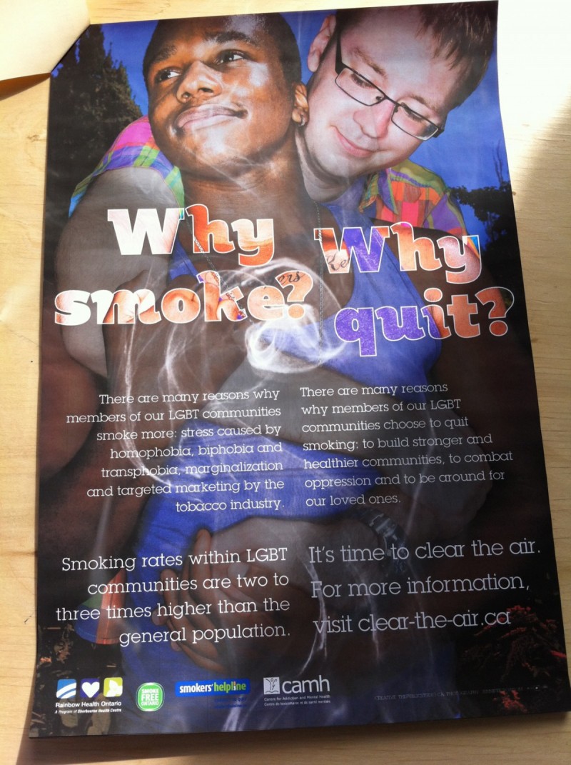 Our Clear the Air campaign is gearing up to launch! Over the past year, we’ve worked closely with Rainbow Health Ontario, Smokers Helpline, Smoke Free Ontario and CAMH, and now, we’re excited to start clearing the air around the homophobia, biphobia, transphobia, systemic marginalization and targeted marketing that contribute to LGBT smoking rates that are twice as high as the general population, and even more excited to talk about the resistance and strength found in these communities that give us reasons to quit.