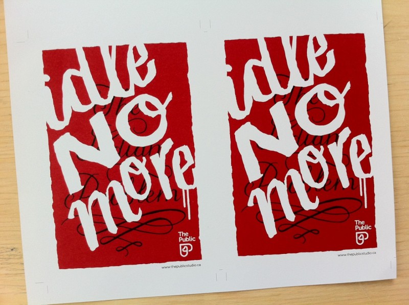 Our Idle No More postcards and posters, are currently being printed (and screenprinted, respectively). Special thanks to Erin McPhee, former intern and freelancer, and part of The Public’s extended family, for the politics and beauty she brought to this piece. We can’t wait to see everything printed, and to add it to our roster of existing people’s history posters (more on this, soon!).