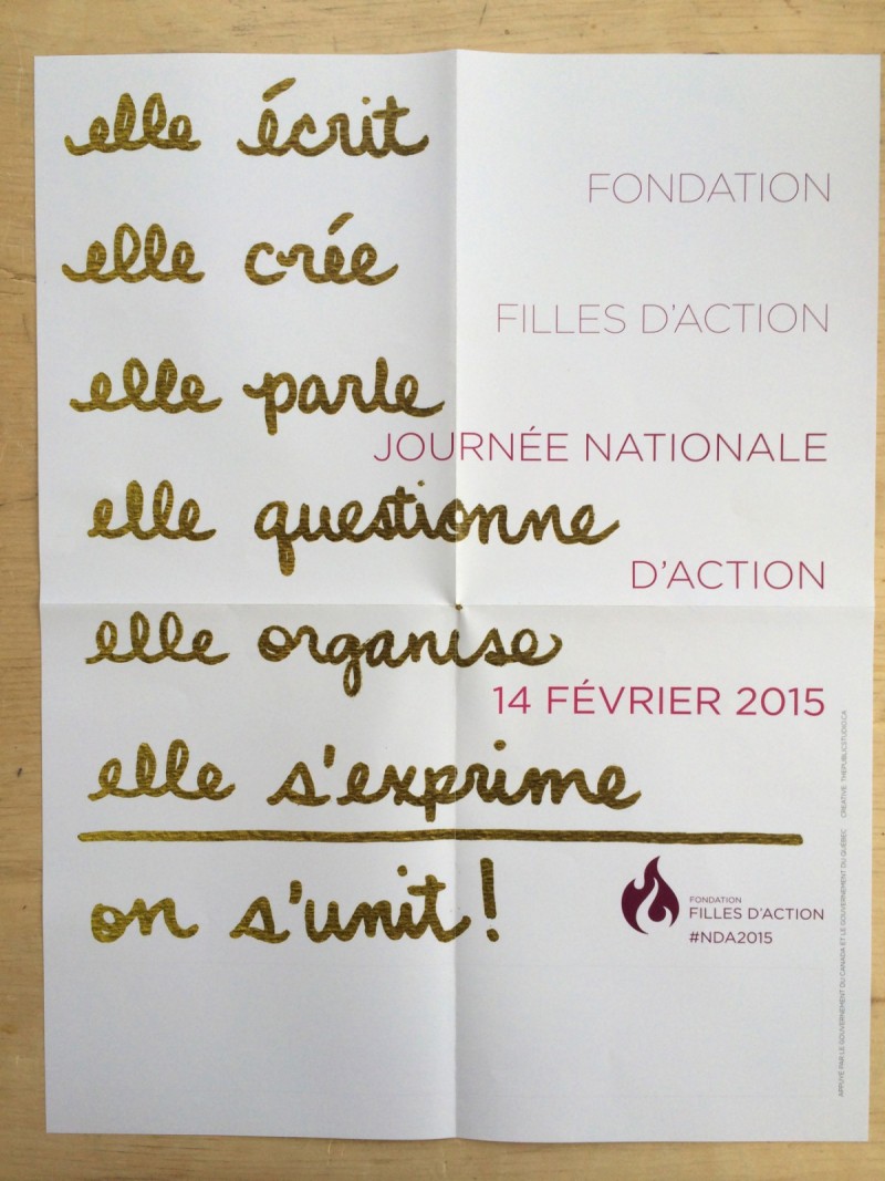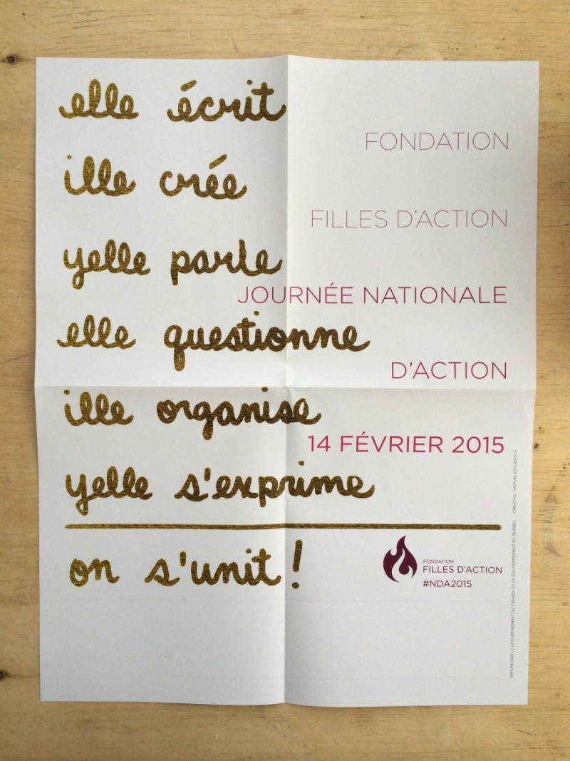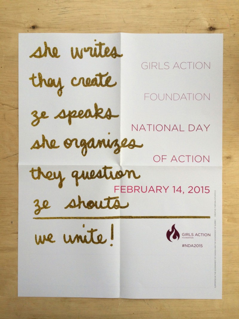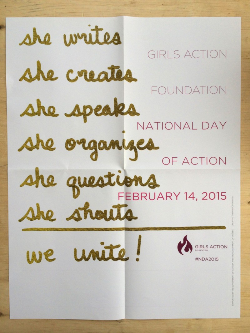 The Girls Action Foundation National Day of Action takes place on Valentine’s day every year. Young women and girls across the country are encouraged to plan their own actions around issues that are important to them; these action-oriented projects can take on any form, and the Girls Action Foundation has a small subsidy they can apply to for support.