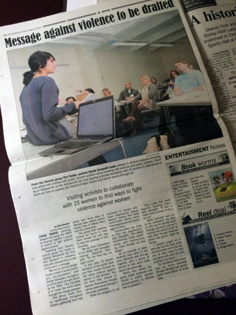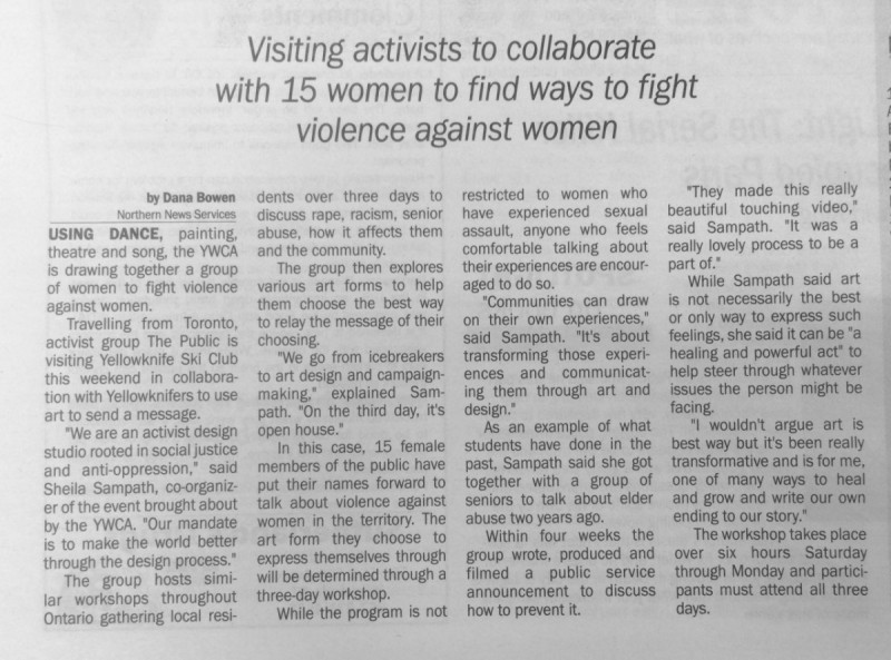 The Public was featured in Yellowknifer’s October 23, 2015 issue on Nat and Sheila’s workshop series via YWCA Yellowknife collaborating with 15 women on using creative energy, art and messaging about sexual abuse.