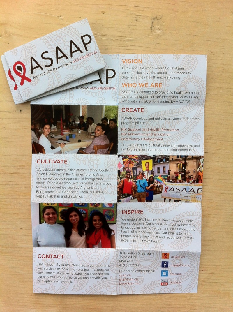 We worked with the Alliance for South Asian AIDS Prevention to develop these handy, pocket-sized agency brochures that communicate ASAAP’s mission and philosophy, guiding principles, services and programming. We are grateful for all the work that ASAAP continues to do for diverse South Asian communities and look forward to other projects we have on the go with these awesome, wonderful people.