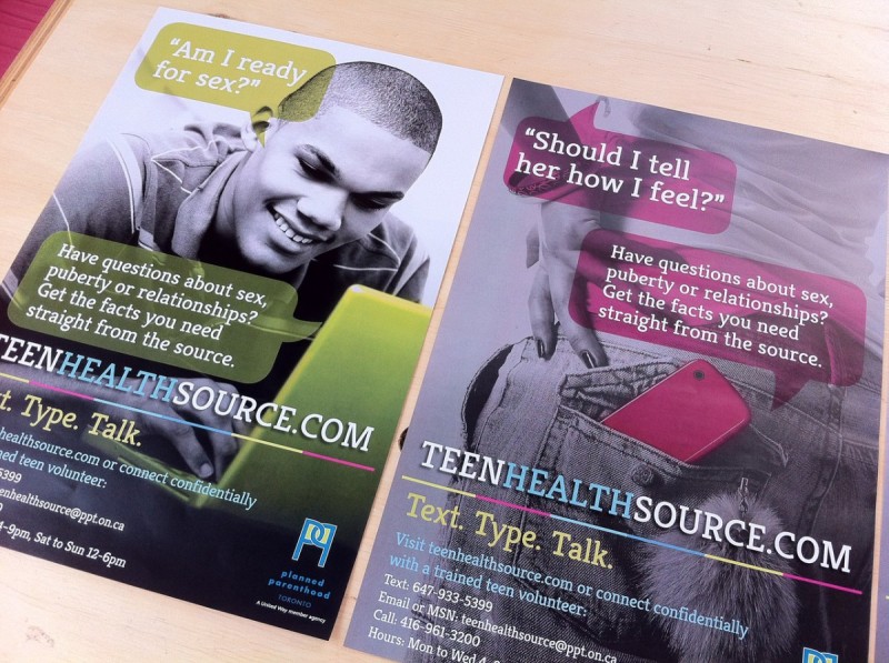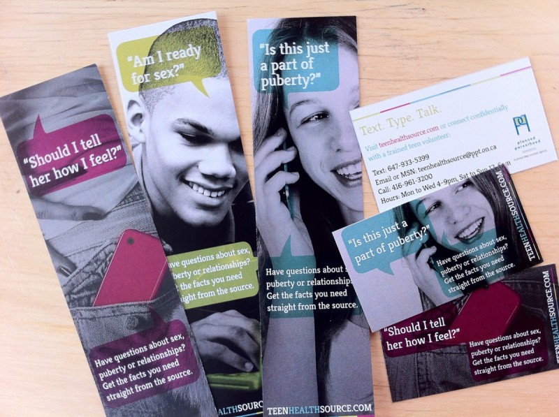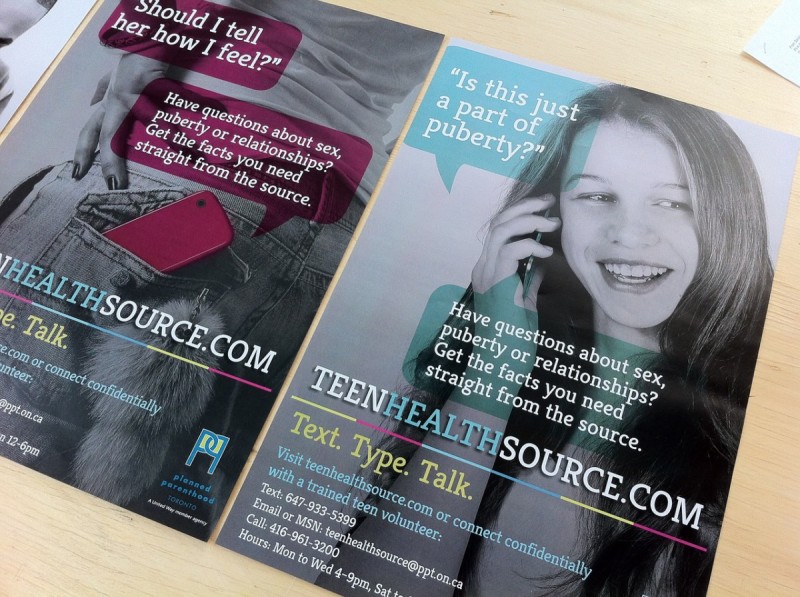 We’ve been working with Planned Parenthood Toronto on the promotion of teenhealthsource.com, a new website, chat and texting service connecting teens to trained teen volunteers for sexual health information. We just got the proofs from the printer; here’s a sneak peek!